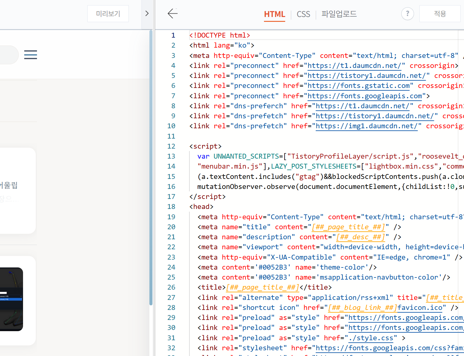 ▲ 티스토리 스킨편집기의 HTML/CSS 코드