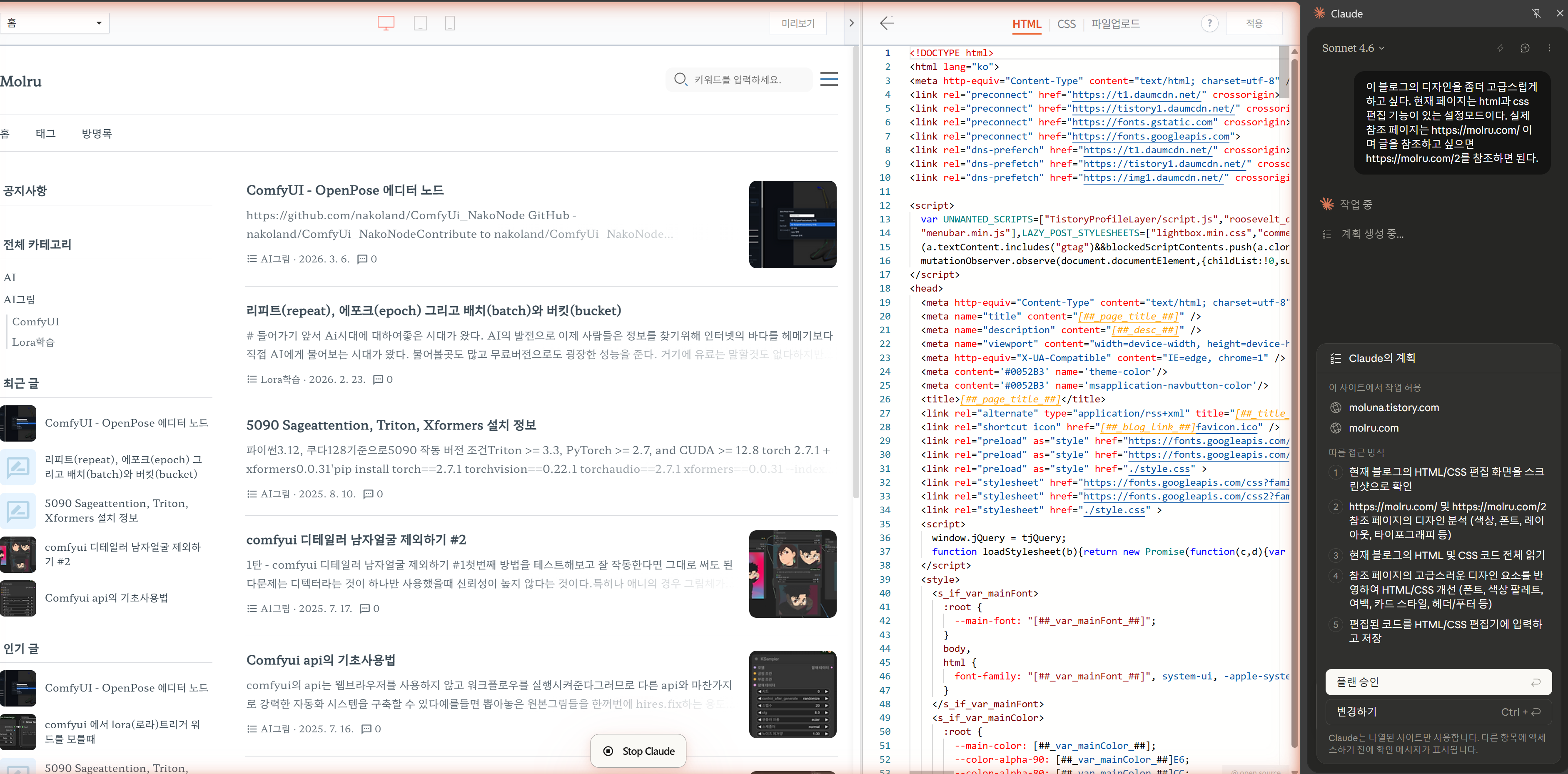 ▲ 사이드바에서 티스토리 스킨을 분석 중인 클로드