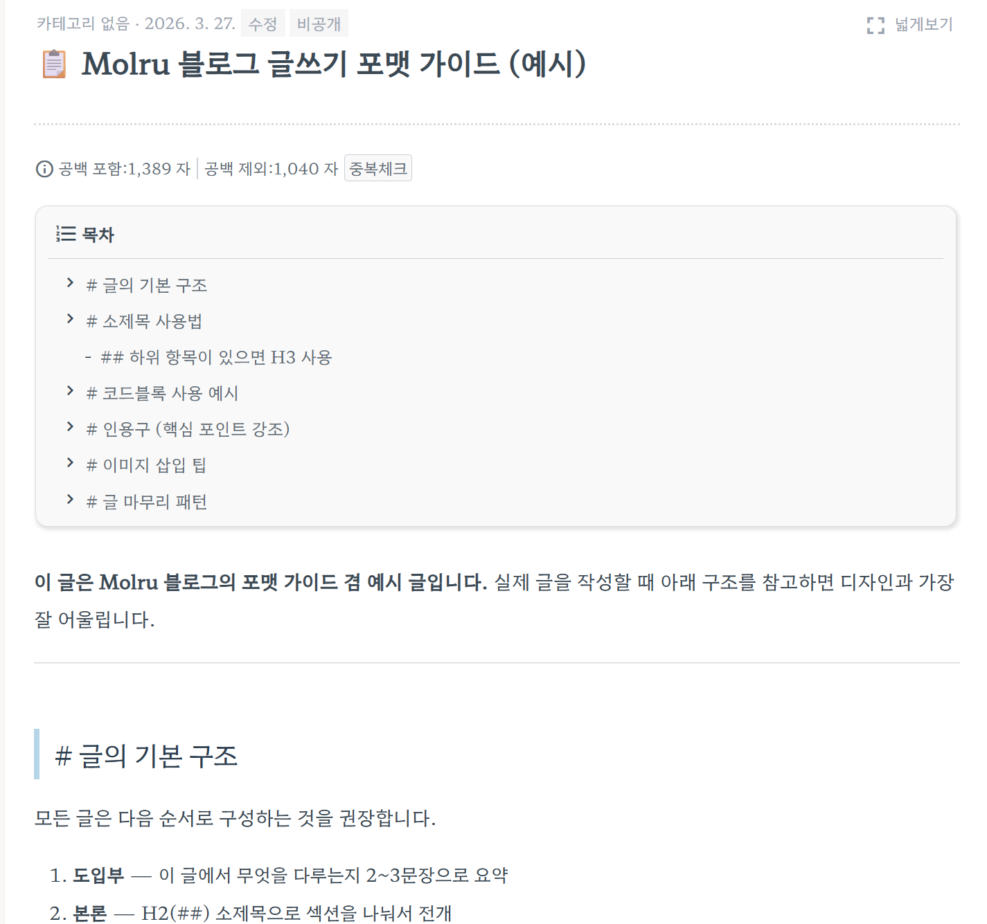 ▲ 실제 내 블로그에 직접 작성해준 글쓰기 예시